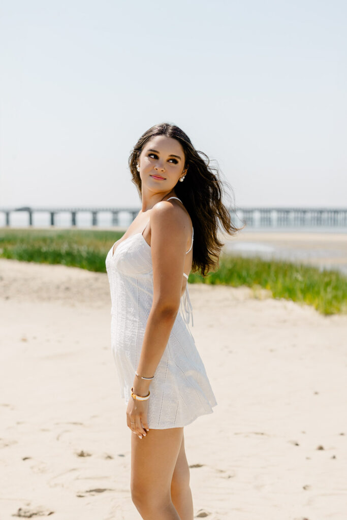 After the butter yellow dress for her senior pictures, Ayanna transitioned into a white eyelet mini dress for a playful, fresh look. Then came a chic, breezy white top paired with light-wash wide-leg denim – perfect for portraits under the weathered wood of the Powder Point Bridge. Finally, she slipped into a navy tank and white pants for a polished but relaxed coastal vibe, finishing out the session with elegance and ease.